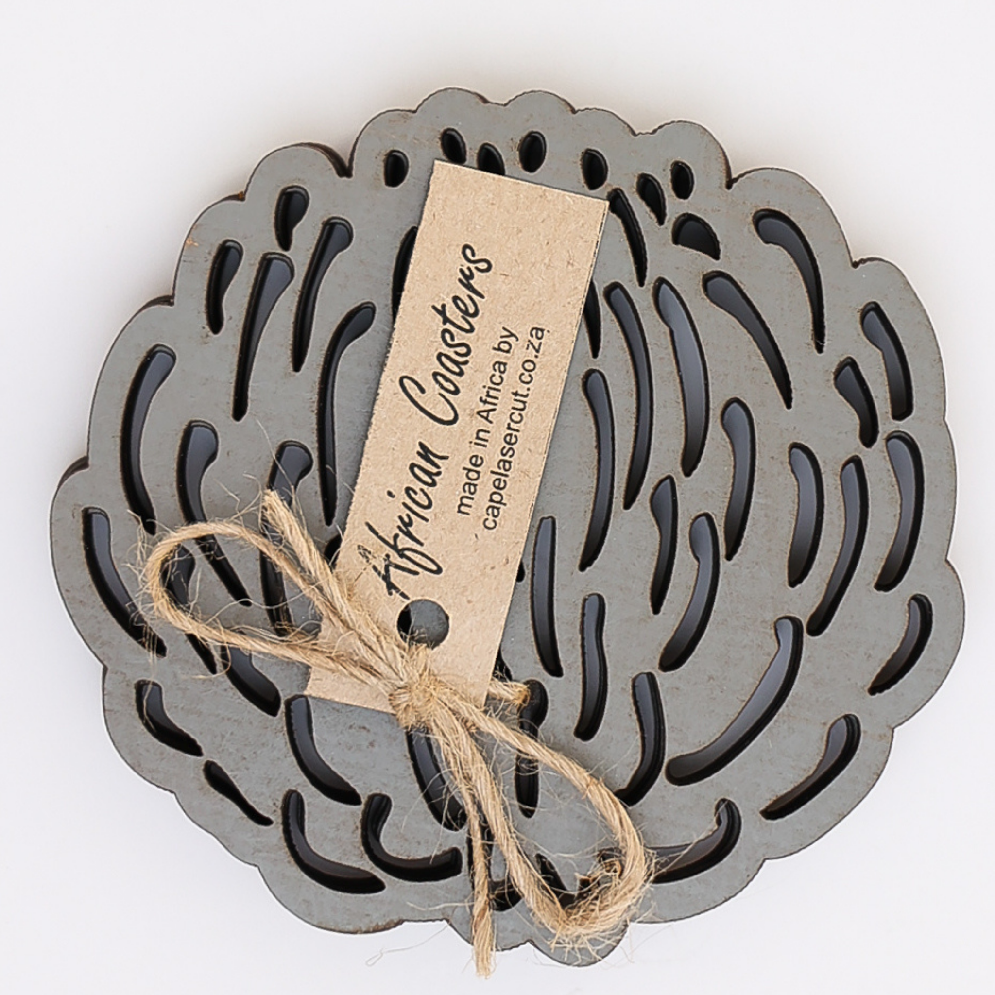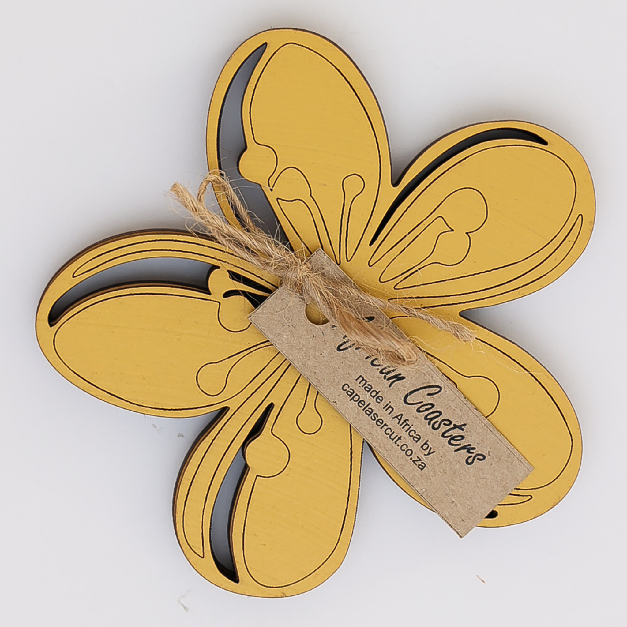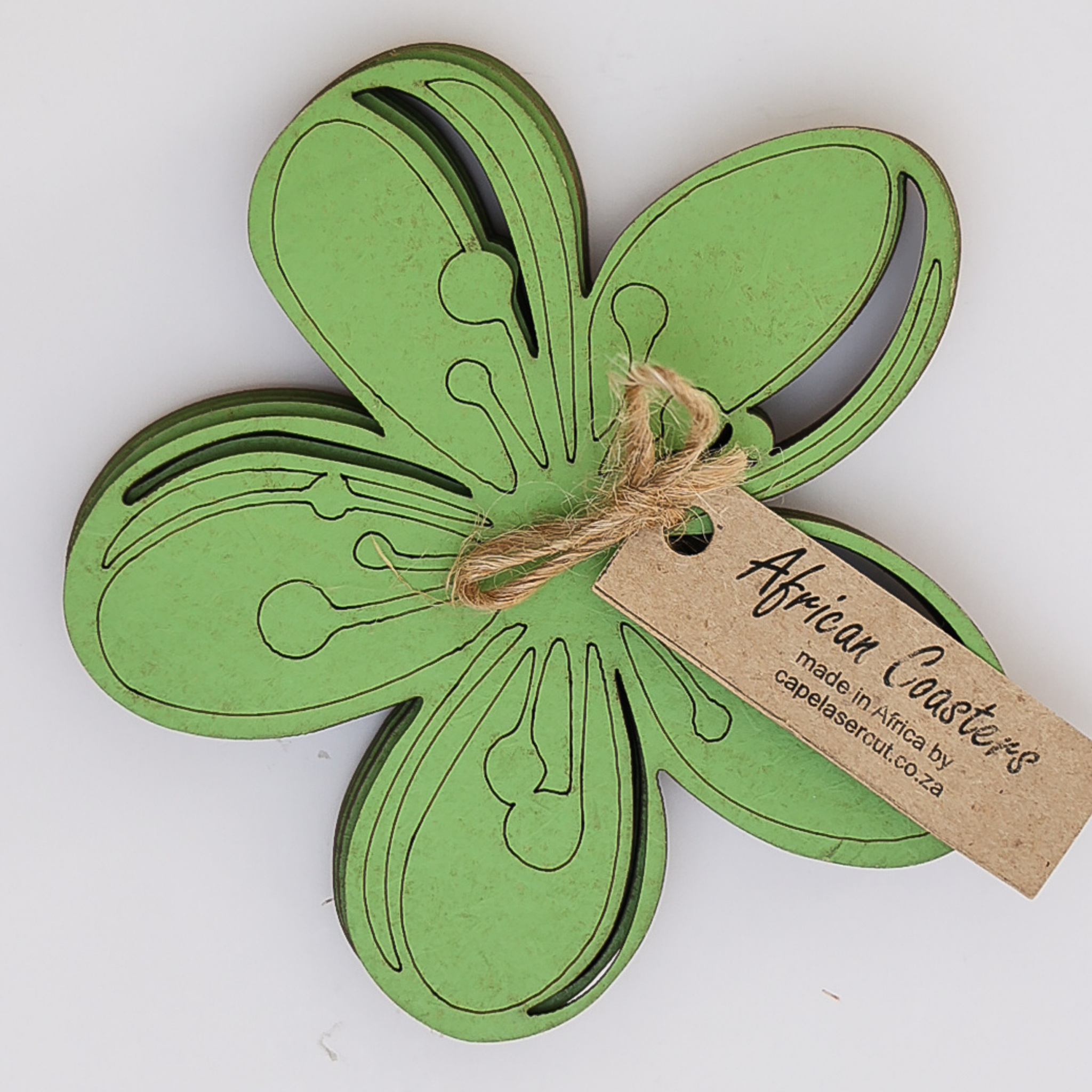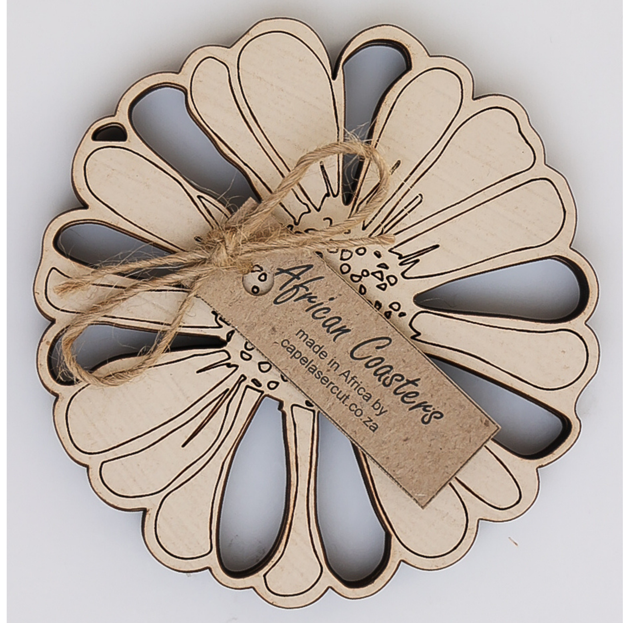 Elevate your table setting with our stunning collection of 4 finely-crafted coasters. Each one features a delicate flower design, meticulously laser-cut from premium MDF for an effortlessly sophisticated touch.. Made in South Africa, these coasters are a tasteful addition to any home, exuding a sense of elegance and exclusivity.